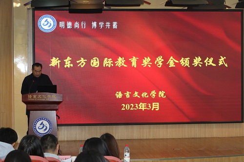 颁奖仪式上,学院党委书记、院长李万强宣读了《语言文化学院新东方国际教育奖学金评选办法》及获奖学生名单。校学生资助管理中心主任薛建鹏、新东方西安学校国际教育培训部总经理夏云辉为二十名获奖同学颁奖。获奖学生代表吴雨桐同学发言,表达了对新东方西安学校和学院培养的感激之情,并表示将全面提高自身素质,以兴农为己任成为国家需要的综合性高素质人才。