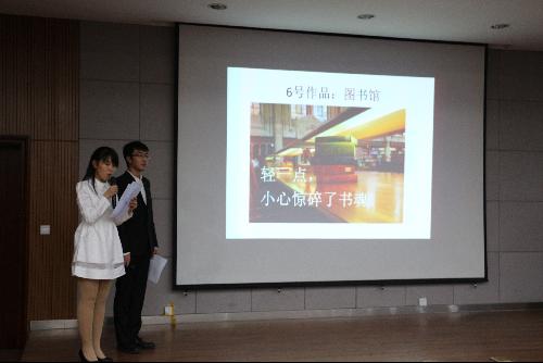 表彰大会首先展示了参赛选手们的作品,选手们从校园绿化,食堂,图书馆等各个地方细心观察,设计了别具风格的标语,既有“唏嘘两少年,仁心护微草”此类文学风味浓厚的标语,也有“把车给本宝宝停好!还上天了!”此类新奇古怪的网络用语,展现了选手们丰富的想象力。对于“我耀我门牌”的宿舍门牌设计,选手们从各个方面收集素材,展现了宿舍独特的有爱风格。