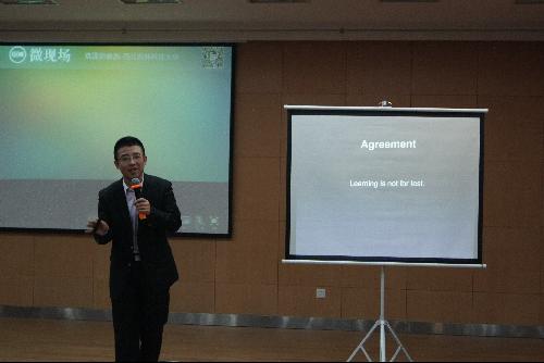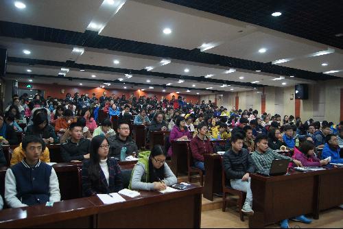 王雷老师首先从听力入手,指出“学生不只是要多听,更要会听”。之后王老师又从敏感性、逻辑层次训练、记忆表达三个方面进行了细致讲解。老师的讲授妙语连珠,触类旁通,使原本枯燥的听力学习变得生动有趣。王老师的精彩讲解激发了同学们极大的兴趣,并赢得了热烈的掌声。