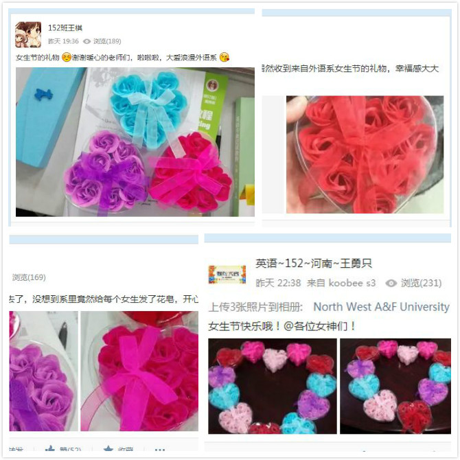 送出鲜花皂,芬芳三月天。外语系部门工会为全体女生精心准备了心形盒装小花皂,并与女生节当天向全系女生发放。花皂虽小,但是芳香四溢,蕴含了外语系领导们对学生们浓浓的关切和深深的祝福。五彩缤纷的小花皂正如女生们如花怒放的青春,有的张扬、有的颔首,但都是她们一步步走向成熟和人格独立的见证。女生们收到礼物后纷纷表示惊喜,大家在QQ、微信上发状态表达对外语系领导们的感谢和收到礼物后的感动。她们有的写到:“谢谢暖心的老师们,大爱浪漫外语系”“收到来自外语系女生节的礼物,幸福感大大提升啊”;当然也有来自男生们的祝福,男生们纷纷表示祝福女生们节日快乐,希望与女生们友谊永存,共同成长。