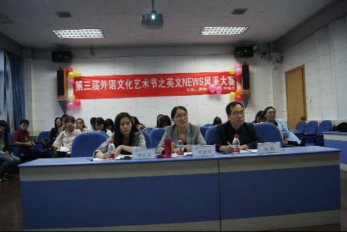 此次大赛主要分为两轮进行。第一轮为“新闻播报”环节。每位同学播报一篇新闻报道,讨论一个话题,从播报中能看出各位同学准备充分,口齿伶俐,发音清晰。第二轮为“新闻表演”,每组同学通过PPT展示,小组情景剧表演,以团队形式进行,每位同学都将自己的表演表现的精彩到位,淋漓尽致。在这场比赛中,第一轮与第二轮相比,第一轮体现的是语音语调的标准性,第二轮则更考验团队的合作精神。我系开展这次活动的是为了通过让学生用英语来表现平时的学习效果,让英语真正融入学生的生活。比赛结束后陈毅老师对本次比赛做了精彩点评,对同学们的精心准备表示肯定,在新闻表演方面入选材料新颖,设计和组织方面,很好的利用了团队之间的合作,希望继续创新,使表现更为突出。经过评委公正评比,选出罗美琪、雷雨雁、郝广杰等10人进入决赛。