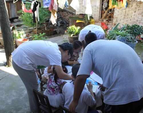 下午的活动是支教,我们将一些家中父母比较忙,不方便照看的小朋友召集起来一起做暑假作业。由于小朋友们年龄参差不齐,我们就一个人负责一到两个小孩子,而我负责的是一个正在学数数的小女孩儿。教小朋友不像教初中生讲了就能懂,这个年龄的孩子学习全靠有趣的图像记忆以及一些重复性的记忆,就像他们的儿歌“一像铅笔能写字,二像鸭子水中游,三像耳朵能听话,四像红旗迎风飘…”,如果不是这看似简单的儿歌,孩子们怎么能记住这看不出含义的数字呢?学校的教学楼里有一处标语写着“教育不是灌满一桶水,而是点燃一把火”。多么形象生动的比喻,孩子们的潜力是无限的,我们做不到强行灌输知识,但如果我们能给他们启迪,点燃他们智慧的火炬,他们必定能闪闪发光。