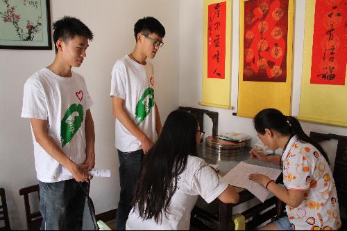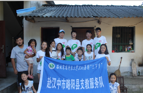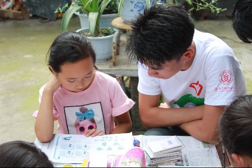 每天的清晨,队员们在鸡鸣中匆匆结束早饭后,就迎来了一群可爱的孩子。这些孩子的父母在暑假中还要工作,而地处山中的接官亭又几乎没有假期辅导班,再加上当地教育水平和质量都并不高,他们的暑假往往在孤独寂寞中打发时光。队员们来到的第一天便挨家走访,把他们集中在一起,在照顾他们的同时,帮助他们复习了上学期课程、完成了暑假作业之后又预习了新学期的课程。小小的庭院中围坐着一群孩子,他们当中年龄大的已经读小学五年级了,年龄小的才读小学一年级;他们有的在学习数学,有的学习英语,还有的在学数字运算。尽管孩子们的年龄参差不齐,队员们还是尽量照顾到每一位孩子,用自己的爱心、耐心和知识灌溉着孩子们心中的田野。10天的朝夕相处,让孩子们和队员们的感情愈发深厚,送孩子们回家的路上,孩子们和队员们一起唱起了队员许景阁曾经教过大家的歌曲《那些花儿》。