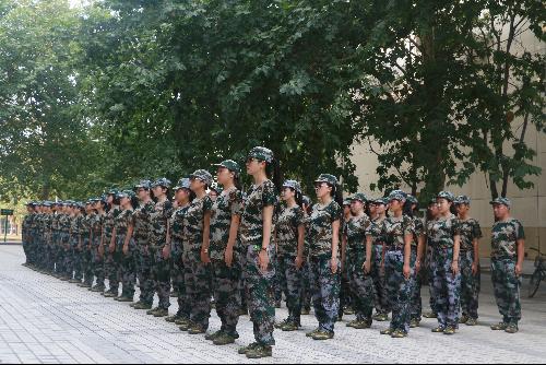 挽起心爱的长头发,放弃美美的新头饰,抬头、挺胸、腰板笔直、目视前方。“站成一条线,连成墙一面”,训练场上的女生们一扫平时的公主气和男生们一起接受训练任务,半个小时的预热军姿没有一个人主动要求退出。身姿挺拔,俨如一朵朵铿锵玫瑰,形成了军训场上一道靓丽的风景线。
