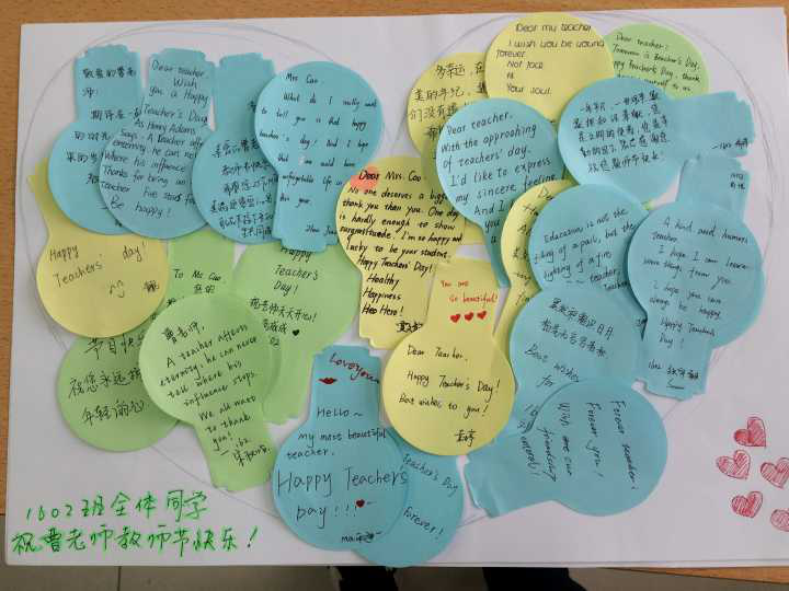 我们将对您的祝福写在纸上,却道不尽我们对您的感激。一个一个小纸片组成的一颗大大的爱心的形状里藏着我们满满的小心情与期待。您的笑容安稳了我们每一颗有些小忐忑的心。师恩难忘,将宝贵的人生经验馈赠;师情冗长,为我们指引幸福的前程;师爱无疆,震撼着心灵最柔软的地方。