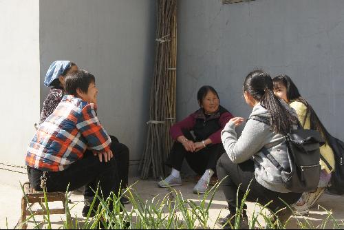 活动中,志愿者们与该村老人们聊天谈心,帮助他们打扫卫生、清理菜地杂草。在与老人聊天时,志愿者们询问了村民们的居住、饮食、医疗卫生及教育等基本生活情况。交谈中,志愿者们了解到:上川口村是中国西北享有盛名的锣鼓生产专业村,该村锣鼓加工业从18世纪开始,距今已经有300多年的历史了。20世纪末,这一传统手工业在上川口村的发展达到了历史上的最好时期,个体私营作坊遍布全村,一度出现了"女人会烧火,男人精铸铜,老人善做鼓,青年跑经营"的红火场面。现在,村内内白天基本家里剩下的上都是老人和儿童,老人们平日里主要是照顾小孩,有些老人还通过担任环卫工人来补贴家用,有的老人则在小区的空地上开垦出一片菜地,种上各种各样的菜来供大家分享,村民之间邻里非常和睦。