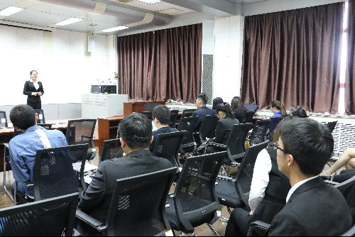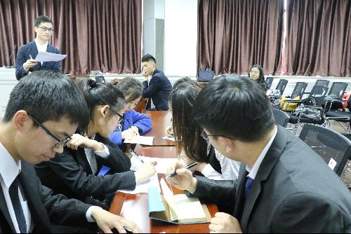“面试”现场,同学们着装整齐、仪态端庄,在向面试考官递交简历之后,便在等候区静候。接着,现场的每名同学依次进行了3分钟的自我介绍,从他们的表现中不难看出,有些同学的自我介绍准备充分、内容精彩、信心十足,然而也有的同学存在着些许的不足。金博博在这一环节的点评中指出,作为一名面试者应该用一些标签让考官能够记住你,并且在简介中明确地呈现出自己的优势,让考官能够快速的了解你,同时要注重自己的着装和仪表,第一印象很重要。在接下来的即兴演讲环节中,同学们通过随机抽取纸条的方式获得自己的题目,在1分钟的思考后,进行了2分钟演讲。即兴演讲考题范围广,涉及英国脱欧、大学生裸贷、共享单车、抵制乐天等话题。不难看出,即兴演讲在要求面试者具有较高的临场应变、语言组织和逻辑思维能力外,还要求其对时事热点有较高的关注。无领导小组讨论中,面试官将同学分成2组,每组6人,对考官所给出的题目进行3分钟阅题,随后开始为时20分钟的讨论,最后小组选派一名代表进行2分钟的总结发言,考官对每个面试者的表现进行记录并评分,参与同学竞相发言,讨论气氛十分热烈。金博博在交流中谈到,无领导小组讨论“套路”很多,要求面试者尽可能的展现自己处理问题的思路和能力,避免沉默不语或过于表现自我的情况。最后,金博博从简历评估、自我介绍、即兴演讲、无领导小组讨论四个方面多维度地对同学们的面试表现进行了详细的评分反馈,并就同学们在今后需要加强的方面提出了中肯的改进建议。