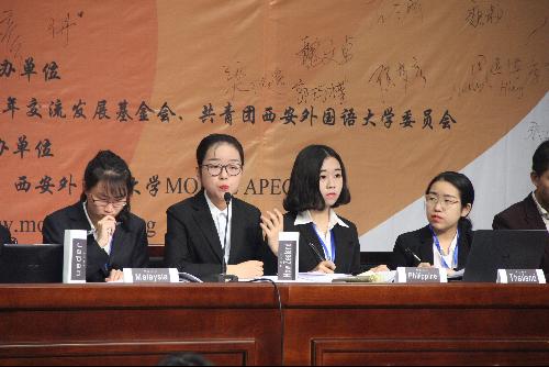 西北地区大会采用模拟APEC会议的形式进行,由北京市环亚青年发展交流基金会副秘书长高鑫女士担任评委,42名选手分别围绕“应对气候变化”、“城乡可持续发展”、“提高食品安全,降低粮食损失”、“发展粮食贸易与投资”四个议题,为各自代表的经济体依次进行了立场陈述与自由讨论。整场比赛选手们积极发言,激烈讨论,观点新颖,自信沉稳,充分展示了自身扎实的英语功底和广阔的国际视野。