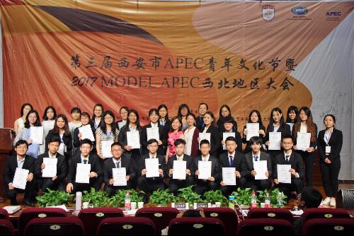 2017年6月2日至4日,由亚太青年模拟APEC大会组委会、北京市环亚青年交流发展基金会、共青团西安外国语大学委员会主办的“第三届西安市APEC青年文化节暨2017 MODEL APEC西北地区大会”在西安外国语大学长安校区举行。来自西安交通大学、西安电子科技大学、西北大学、西北农林科技大学、辽宁师范大学、吉林大学、苏州科技大学、江苏师范大学、山西大学等22所高校的42名选手参与了开幕式。我校共三名学生通过校内选拔晋级西部地区大会,荣获优秀奖。