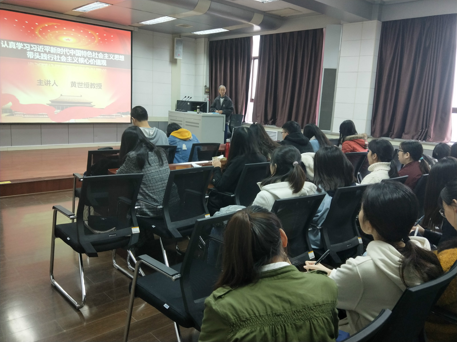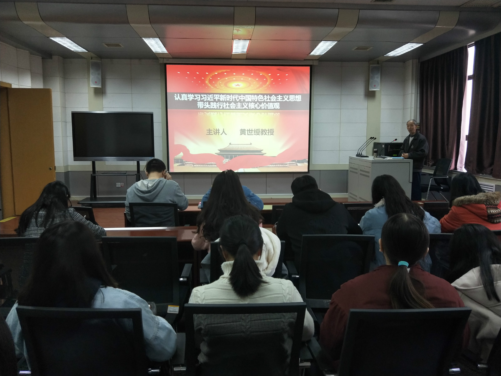 11月1日,外语系举办主题为“认真学习习近平新时代中国特色社会主义思想,带头践行社会主义核心价值观”的十九大精神集体学习活动,我系党建组织员黄世绶教授带领全体学生党员进行学习。