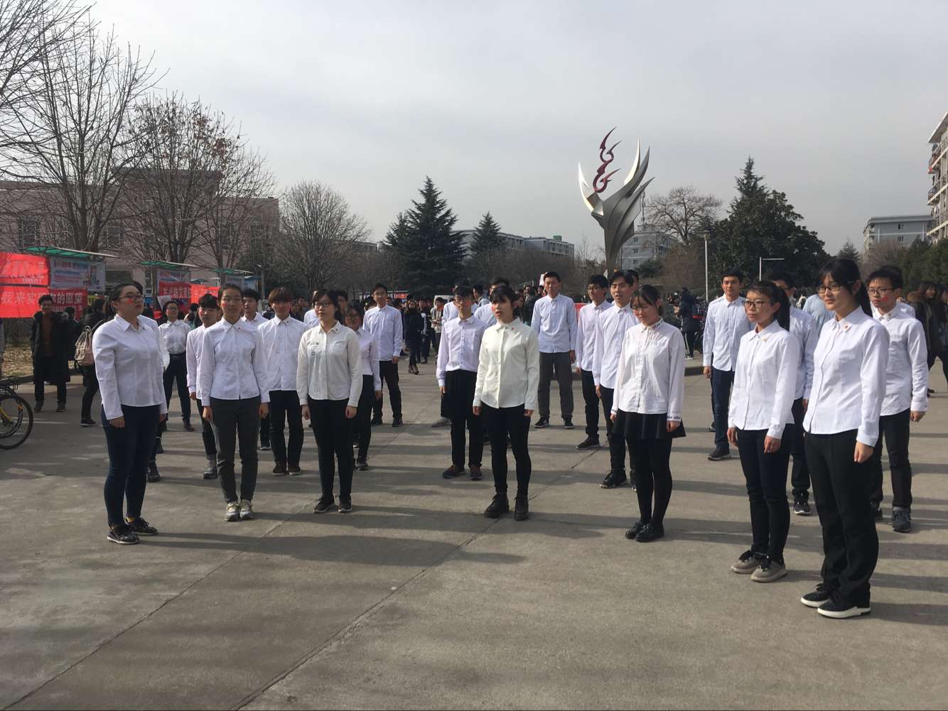 活动开始,由工作人员组织答题活动,参加快闪的同学装作路人在有序地答题。待到冲锋的号角响起,便是快闪活动开始的标志。同学们纷纷脱下外衣,他们穿着统一的白衬衫,戴着团徽,脸上贴着国旗标志。很快他们排好了队形,开始唱响嘹亮的红歌。选唱的曲目有《映山红》,《太行山下》等经典红歌,歌声气势磅礴,振聋发聩。同学们用自己的歌声表达着对祖国的敬意,传达着一二九精神,凸显了身为炎黄子孙的骄傲。