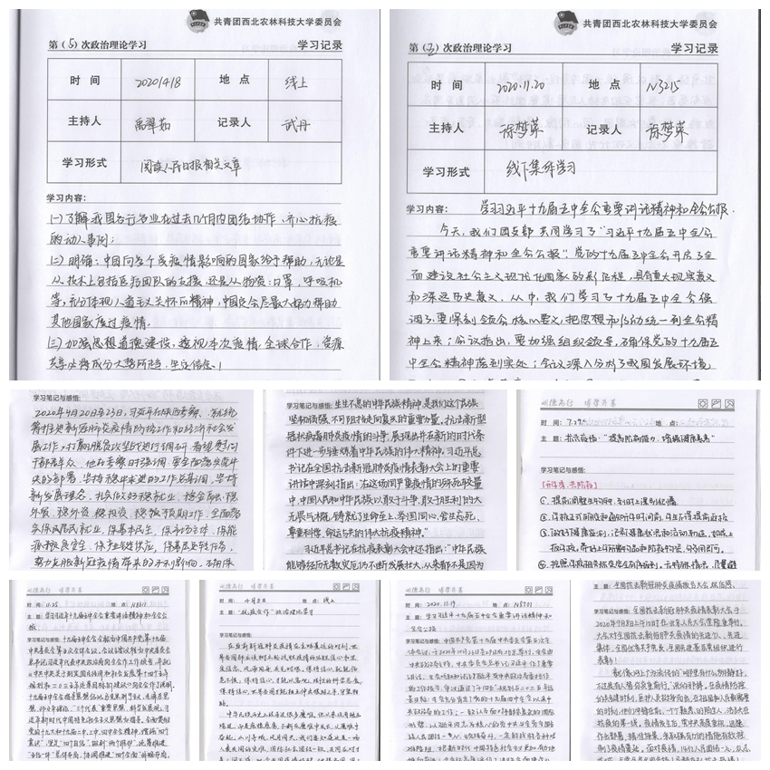 共评选出皮国义、田格、蒋林霖、王程妍、马文静、郭莹钰、刘思睿、吴欣憶、郭奕霖、李凯瑞共10本优秀学习笔记,英语1902团支部、英语1903团支部、英语1904团支部、英语2001团支部、英语2003团支部、英语2004团支部共6本团支部优秀学习笔记。同时优秀学习笔记将在“西农外语”微信公众号及7号教学楼前展示,激励学生认真学习理论知识,以先进为榜样,努力做到真学实学、知行合一、入脑入心。