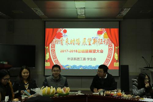 1月12日晚,外语系团工委学生会于7501教室举行了学生工作总结会。会议主题为:回首来时路,展望新征程。出席会议的有外语系团工委书记尹传松,外语系学生会主席团以及各部门部长和副部。本次会议由学生会副主席檀成仪主持。