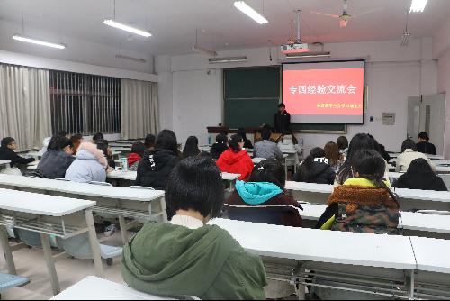 为帮助同学们更好地备战英语专业四级考试,三月九日晚,外语系学生会学习部邀请外语系专四成绩优异的杨轩、郭昕钰、李纪波、王暮翡和邵华五位同学于8118教室进行专四经验交流,外语系大一大二部分学生参加。