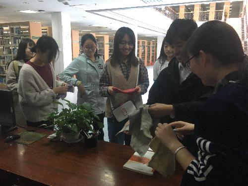 下午三点半,志愿者们早早地来到了图书馆门前等候,由社践部部长带领大家有序进入。首先,他们进入图书馆北中心书库,和工作人员说明来意,管理员便把志愿者们分成两队。两队志愿者分别去往不同的阅读室,问询过管理员后,他让志愿者们分别进行图书整理工作和擦洗图书架上的灰尘。得到指令后,队员们开始分头行动,男同学负责去楼下提水,女同学则挽起衣袖开始清洗抹布。摆放图书也是一大挑战,因为不知道书上的标签所表示的含义,志愿者们请教了管理员,他耐心地解释了每个字母和数字代表的含义,根据这些,便可以迅速地找到图书应该在的位置。大约两个小时之后,两队志愿者都完成了相应的工作,管理员对志愿者们表示了感谢,并和志愿者们在工具书阅览室合影留念。
