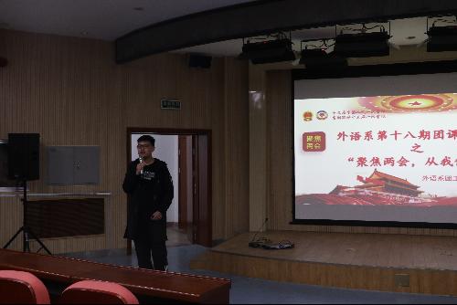 为深入推进学习两会精神,了解国家新形势、新政策、新变化,切实提高我系学生的政治素质,3月15日晚19:00,由外语系组织部为2017级全体学生带来第十八期团课讨论课之“聚焦两会,从我做起”在外语系报告厅开展。团课现场气氛活跃,讨论热烈。