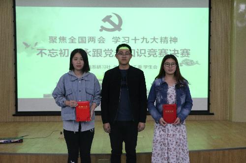 为做到学习党的十九大精神常态化,深入学习习近平新时代中国特色社会主义思想,外语系习近平新时代中国特色社会主义思想研习社以此为契机,于4月9日晚在外语系二层报告厅组织开展“不忘初心,永跟党走”十九大知识竞赛。外语系团工委书记、研习社指导老师尹传松,外语系学生会主席、研习社支书屠菡琳,外语系学生会副主席、研习社副社长张建伟出席了本次比赛。