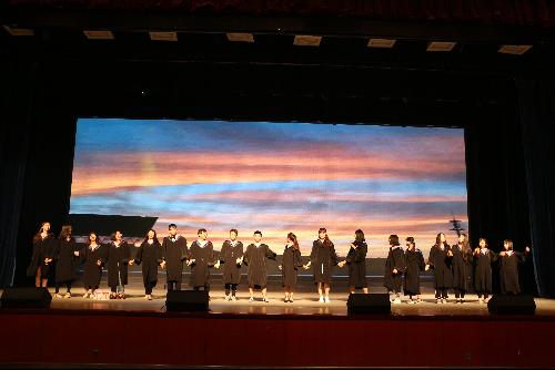 平时讲台上或严肃或端庄的老师,登上舞台一展别样风采。《风筝误》却误不了女教工们别有一番风味的舞姿;“云很淡,风很轻,任星辰,浮浮沉沉……”一曲《岁月》不知悠扬谁心;师生二人共同演绎《春风十里》,把岁月化成歌;伴随钢琴的演奏,两位男教工的《平凡之路》流露出对学子的期望与不舍。“无论你们未来身在何方,即使是千里之外,外语系永远与你们同在。”王波老师说出了所有老师的心声。