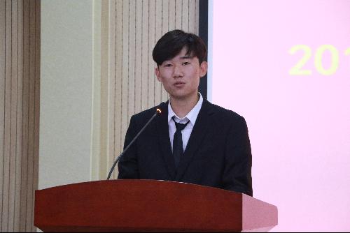 在全体起立奏唱国歌之后,团工委书记尹传松上台发言。尹老师在发言中提到“我想大家需要一点时间、一个平台能够把大家心里所想,这一年来的收获与成长展现出来”,向同学们传达出举办此次竞聘大会的意图与期望。