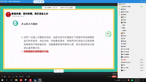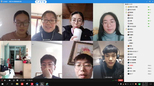 为进一步确保同学们度过一个平安、充实、快乐的寒假,英语1803班于1月31日上午依托班级QQ群举办了“助力保平安,关爱不掉线”主题班会。班会由团支书李晨主持,班主任张乃丹与全班同学而参加了班会。
