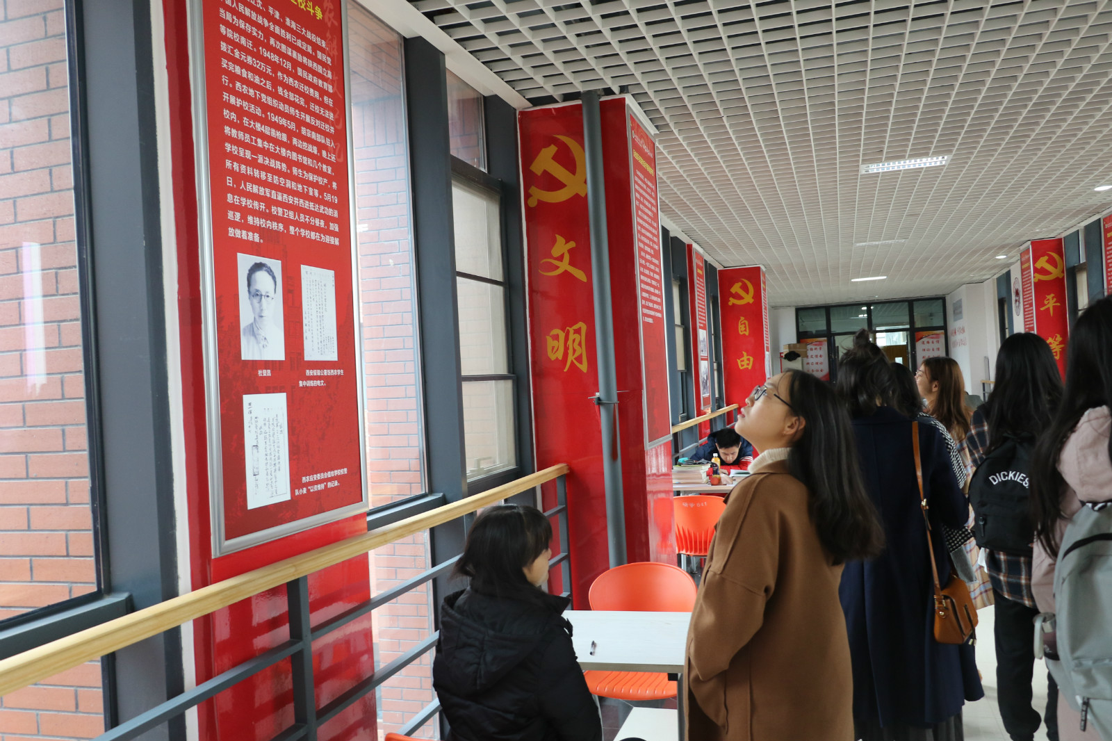 “红色长廊”凝缩着西农的奋斗史,大家在红色长廊共同学习《西农解放记忆》。“两种力量斗争中的西农”、“进步力量在西农开展的民主革命斗争”、“抗战胜利后的艰苦奋斗”等板块展现了西农前辈们为西农做出的巨大贡献,在“反迁校运动和护校斗争的胜利”中,做出巨大贡献的周尧教授的事迹使得同学们回忆起了西农大型原创话剧《雕虫沧桑》,对周尧教授的更加充满敬意。同学们在认真阅读《西农解放记忆》之后,对西农的校史有了更加深刻的认识。