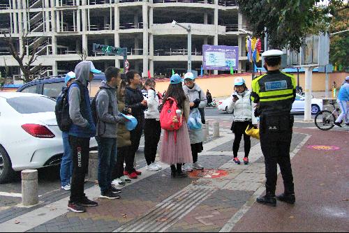 活动中,志愿者们遇到了一起车辆碰擦的交通事故。志愿者周同学说:“我们看到,两辆车相撞后,车主立即停车查看事故情况,狭窄的道路迅速开始拥堵。我们不知所措,不得不求助于杨警官。杨警官到来后,劝说他们尽快离开,并对堵塞车辆进行疏导,不久,道路便恢复了畅通。交警们真的非常辛苦,我们仅仅遇到一起轻微的事故以及间接引起的拥堵已经手忙脚乱,警官们工作期间一定会遇到比我们今天面对的事件更加困难与复杂的问题,而他们必须解决这些问题。我们作为学生,能够做到的就是遵守交通规则,并且尽可能劝说身边的人遵守规则。”