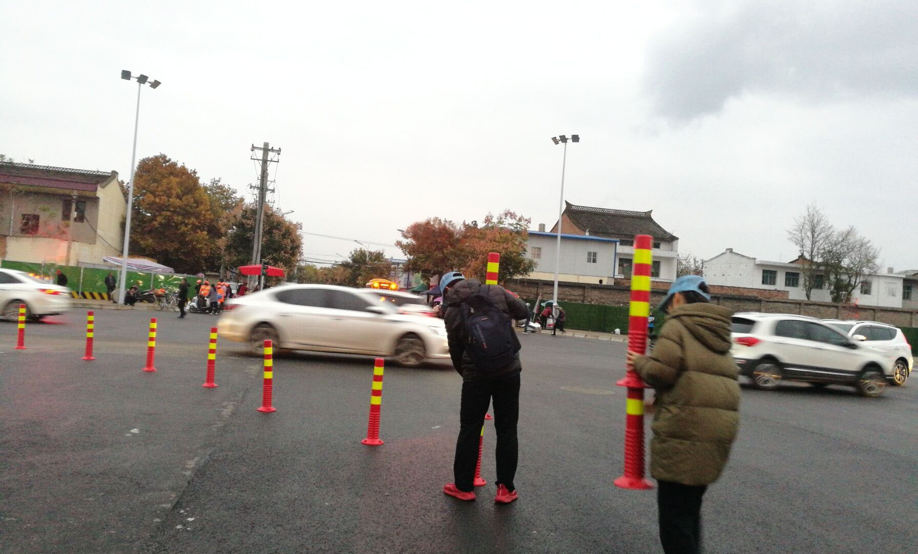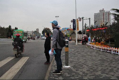下午四点三十分,夕阳的余辉伴随着凛冽的寒风,志愿者一行人来到活动开展的地点。志愿者们由杨警官介绍得知,这里是通往农高会会址的必经路之一,也是杨凌区最大的交汇路口。正值农高会召开期间,来来往往的车辆络绎不绝,许多佩戴农高会工作证的行人匆匆穿行。同时,志愿者们发现,由于道路设计不足,繁华的转盘路口并没有设置红绿灯,只摆放了两个小型可移动式红绿灯临时协调车辆行驶。一些行人在过马路时很难看到红绿灯的显示,仅仅观察有无车辆通过后,直接穿行。这些现象都给农高会的顺利开展增加了交通压力。