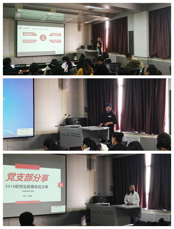 本科生第二党支部的杨淑艳同志分享了2019年研究生招生情况。从各地不同高校的复试分数线、研究生报考人数与录取人数比例等直观的展示了研究生考试的难度之大。并结合当下的新闻讲解研究生清退情况和后续解决途径,告诫党员同时刻铭记“治学严谨”,切不可“浑水摸鱼”。杨淑艳还强调,条条大路通罗马,考研不是唯一的发展途径,党员同志应认清自己的现实情况,找到适合自己的道路,才会创造出更大的价值。