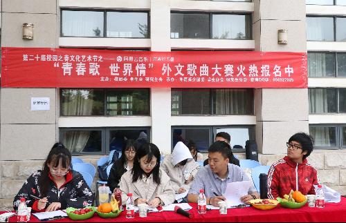 为丰富校园生活,激发我校学生学习外语的热情,营造良好的外语学习氛围,展现我校学子积极向上的良好风貌。4月27日下午,由校团委、学生会、研究生会主办,外语系团委、学生分会、研究生分会承办的第二十届校园之春文化艺术节之----“青春歌,世界情”外文歌曲大赛的初赛在北绣山活动中心南门顺利举办。初赛邀请到上届比赛中的优秀选手王涣灵、杨天煜、张弛、朱丽担任评委。