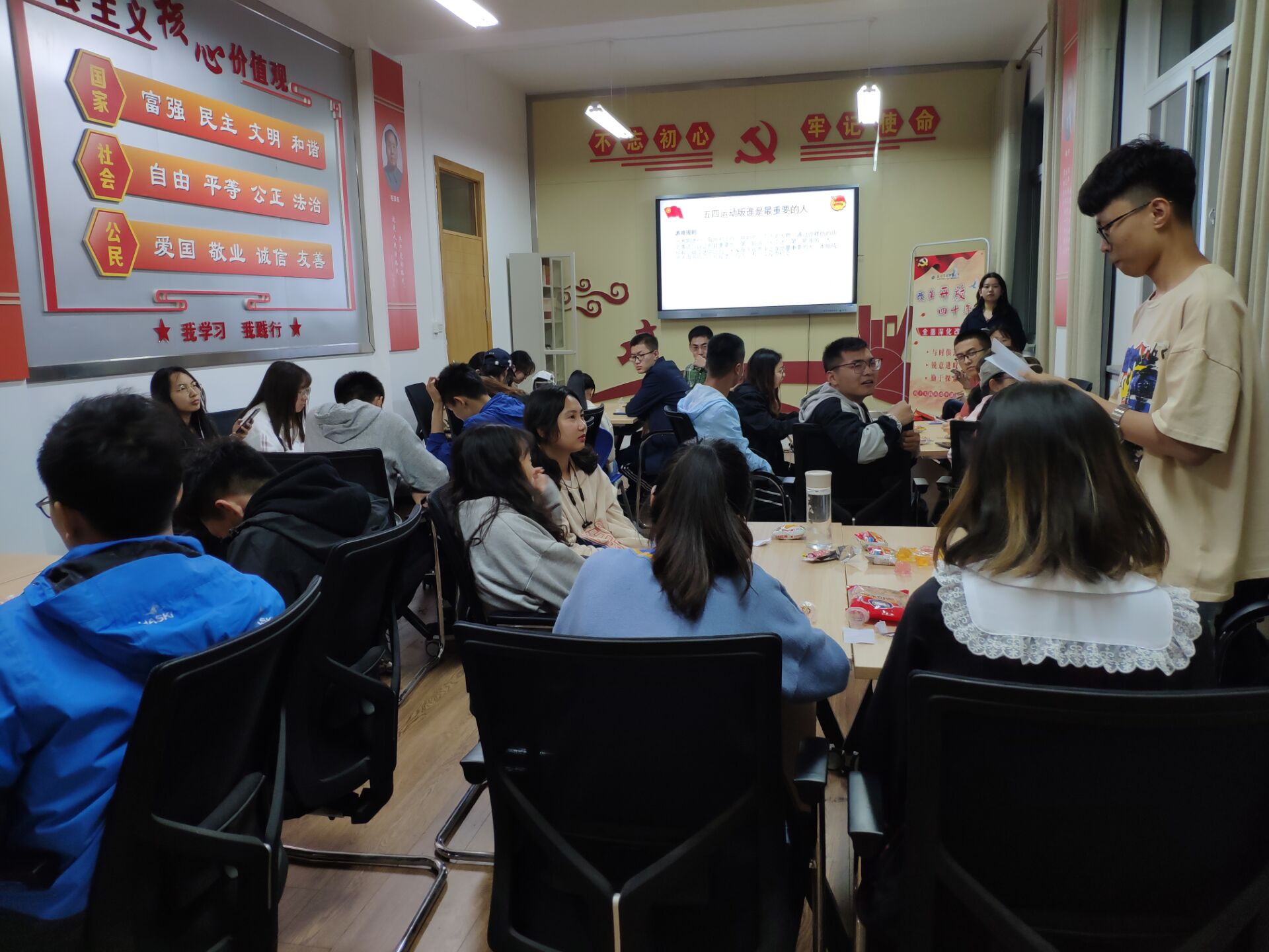 在活动开始前,参加活动的同学首先进行抽签分组,共30人分为5组,随后由每组代表抽取活动辅导材料和文献参考。材料分发完毕后,主持人带领各组员进行宣誓,宣誓结束后正式开始活动。活动一:“五四运动版谁是最重要的人”:分两轮进行,每组对于自己抽到的一个历史人物,通过诠释他的历史事迹以证明其重要性。两轮发言结束后,由未发言的各组成员进行举手表决选出大家认为最重要的历史人物;活动二:“爱国热词版你划我猜”:以爱国及国家百年发展的热词为主要内容,每组都有一次参与的机会,最后得分叠加在活动一的基础上形成第二阶段的排名。活动三:观看五四主题电影剪辑,之后进行中国少年说的集体朗诵,活动结束最后对表现优异的小组进行奖励。