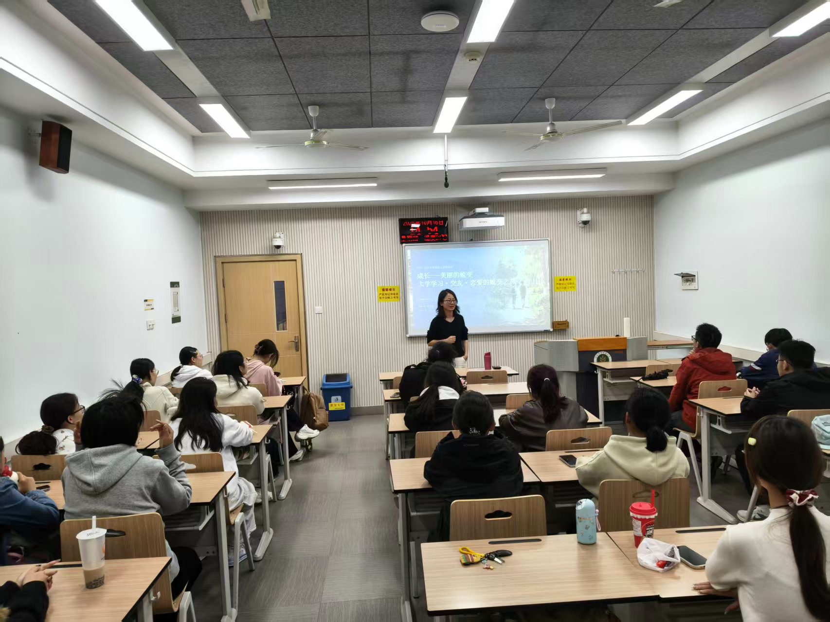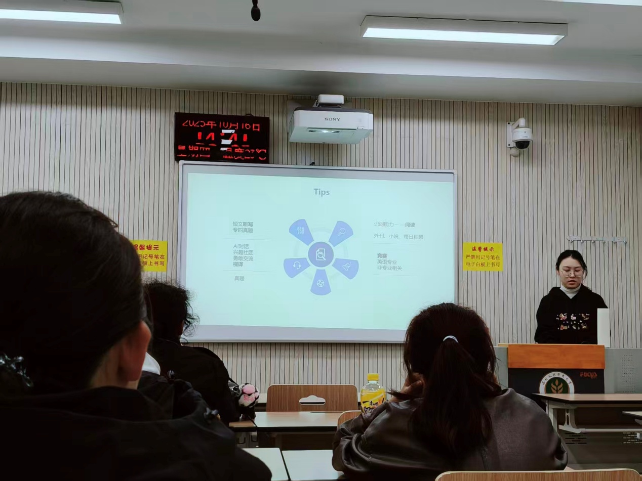 首先,班主任特邀英语23级优秀学姐刘怡萱,结合自身成长轨迹,从“专业学习”、“技能培养”和“目标规划”三大维度,为同学们带来一场干货满满的经验分享会。刘怡萱学姐围绕英语专业学习与技能提升,从课程体系、信息渠道、时间管理等方面细致拆解英语学习方法,强调实践对提升核心能力的关键作用;在技能培养上,她聚焦“听说读写”能力打磨与“输入输出”技能训练,指出专业素养与综合能力是同学们成长的“硬核武器”;同时,学姐结合大学四年成长周期,勾勒出清晰的生涯规划蓝图,为同学们提前锚定大学生涯的前行方向提供宝贵思路。