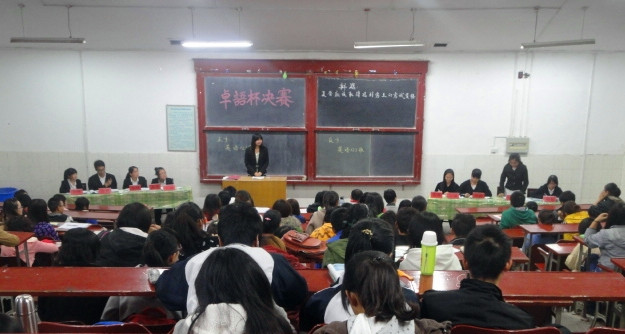 10月21日下午四点半,外语系2012级新生“卓语杯”辩论赛决赛在4101教室拉开帷幕。来自创新、水建、林学等7个学院的辩论队队长充当本次辩论赛的评委。辅导员王琼、邵龙、曹姬倩蕊以及我系主要学生干部出席了本次活动。