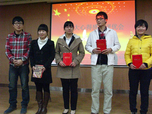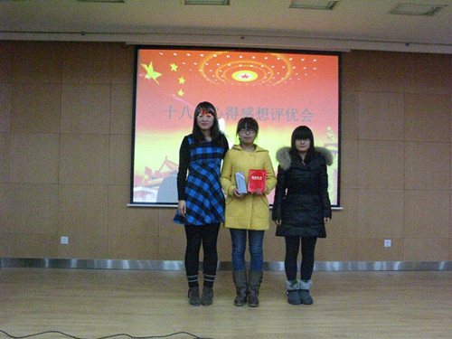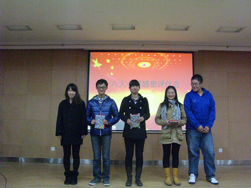 11月25日下午4:30,我系在北校绣山活动中心北报告厅举办了主题为“学习十八大心得感想评优会”的大型团组织生活。团工委书记曹姬倩蕊老师及系主席团全体干部出席了本次评优会,2011级、2012级学生代表参加了本次活动。