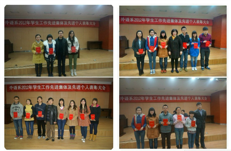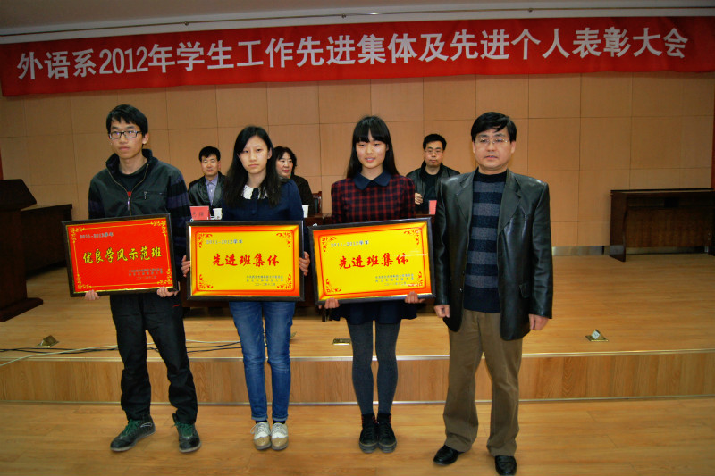 3月6日下午,我系2012年学生工作总结暨学生先进集体、先进个人表彰大会在北秀山南报告厅举行。系党委书记李安民、系主任窦琴、系党委副书记王小平出席会议。外语系副主任田志强主持大会。全体辅导员、班主任、受表彰的先进集体、先进个人代表和学生代表共100余人参加了表彰大会。