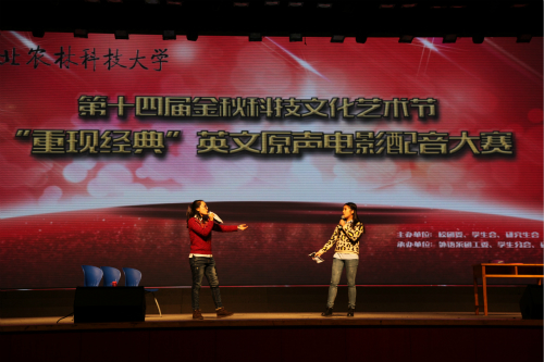 11月14日晚19:30,由校团委主办、外语系承办的第十四届金秋科技文化艺术节之“重现经典”英文原声电影配音大赛决赛于北绣山活动中心举办。校长外事秘书董会庆教授,国际交流处副处长于瑛副教授,外语系副主任田志强副教授、殷延军副教授,外语系侯雅丽副教授担任了本次大赛的评委。外语系党委书记李安民、校团委副书记石颖贤、外语系党委副书记王小平出席了本次大赛。