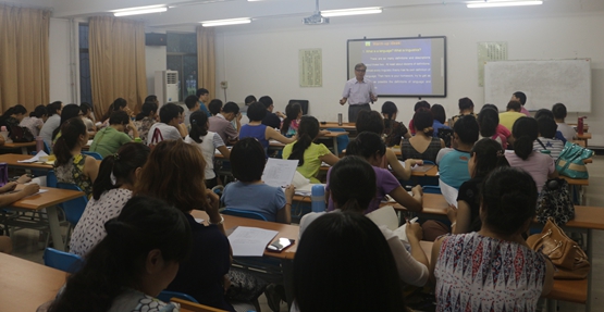7月15日,应外语系邀请,全国著名认知语言学家四川外国语大学王寅教授莅临现场讲学,为期10天的外语系2015年暑期教师科培训正式开班,系党委书记李安民、副主任殷延军出席开班仪式,全系近10个科研学习小组60余位老师参加培训。在开班仪式上,外语系副主任殷延军代表外语系对王寅教授的到来发表了热情洋溢的欢迎词,系党委书记李安民对大家提出了殷切的希望,希望大家克服种种困难,能够全身心的投入到这十天的学习当中。